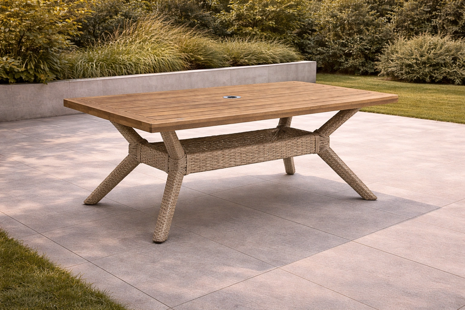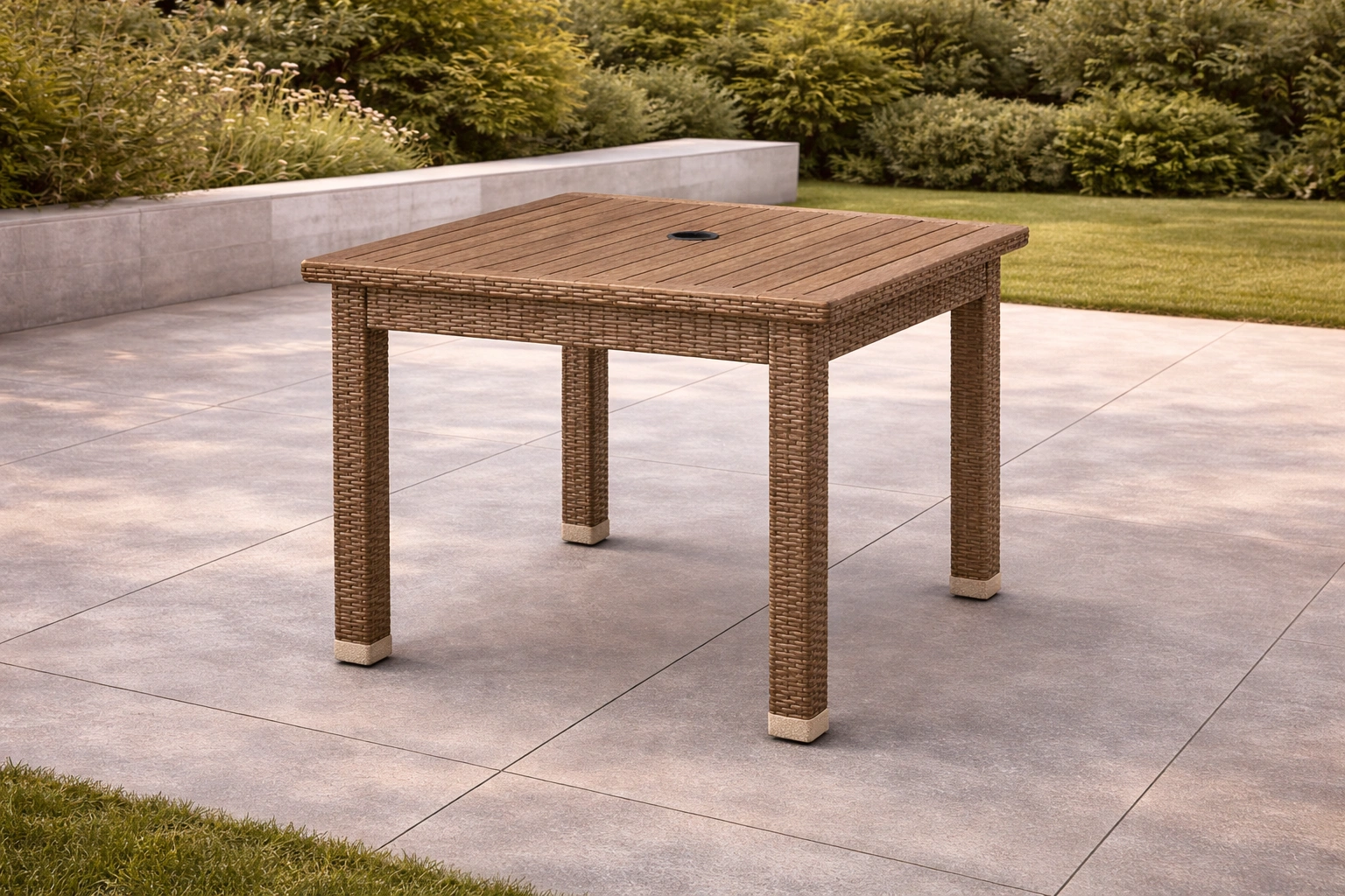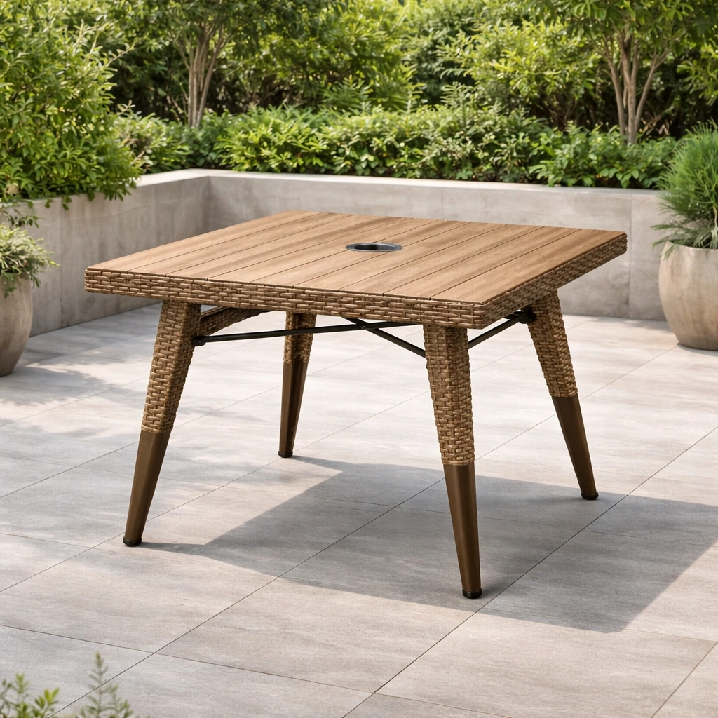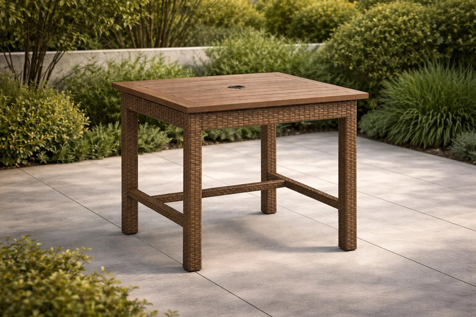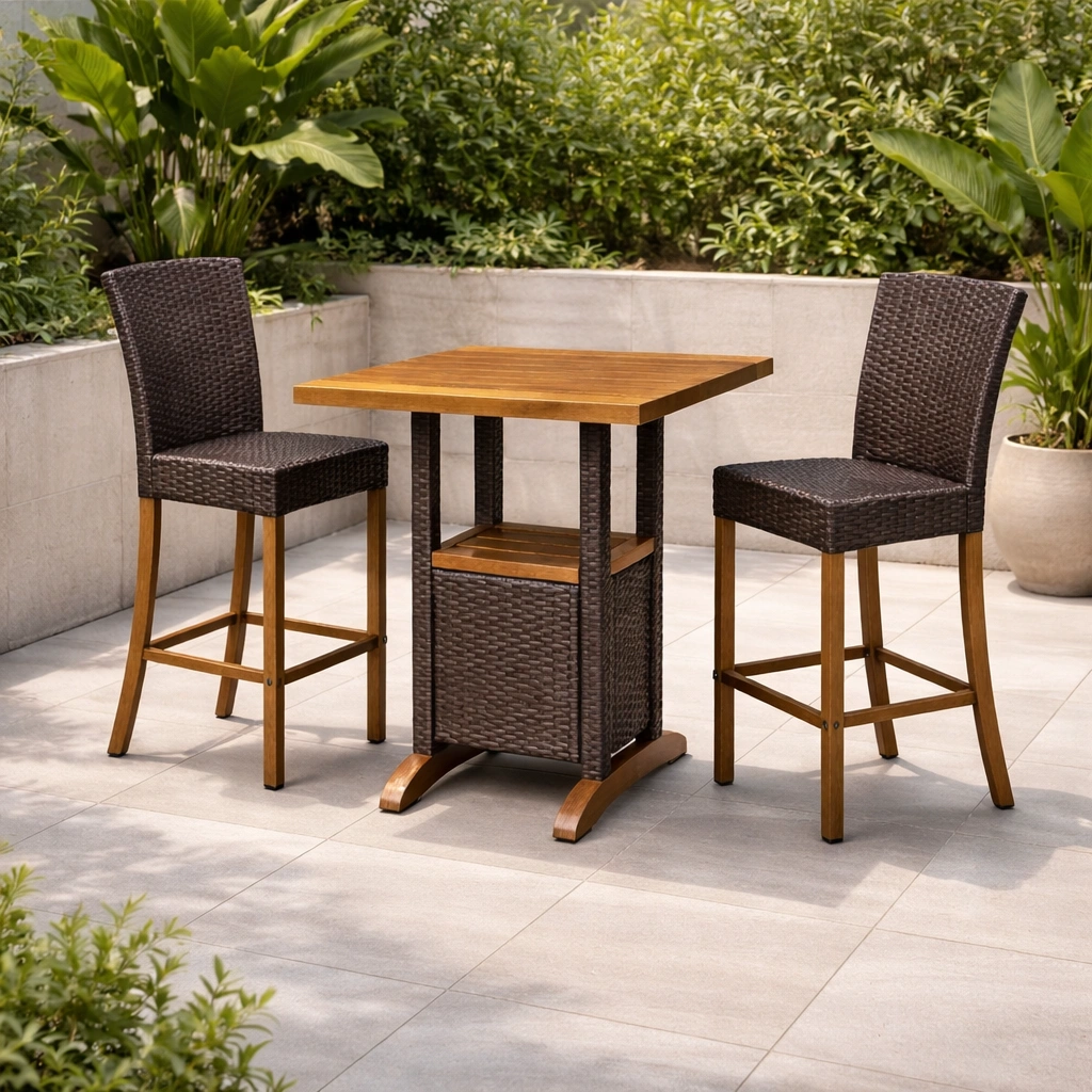 Ensemble de bar en bois et rotin avec table haute et chaises