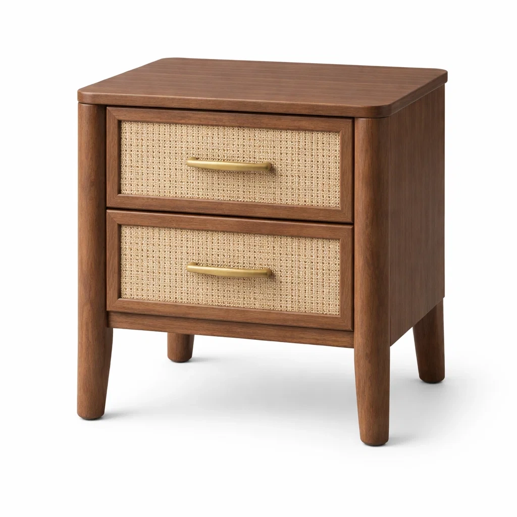 Table de chevet en bois et rotin avec tiroirs