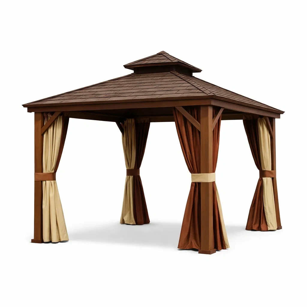 Tonnelle de jardin en bois avec rideaux en polyester marron et beige