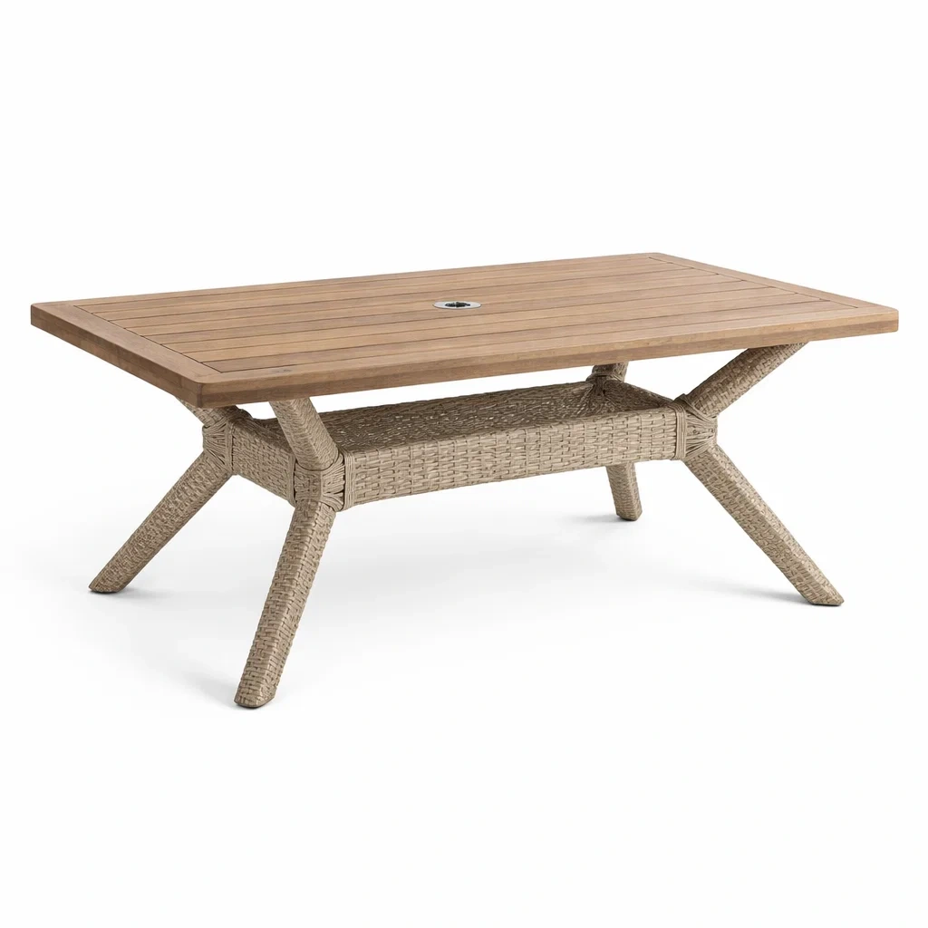 La table de jardin est fabriquée avec un plateau en bois d'acacia et des pieds en rotin synthétique. Elle mesure 210 cm de longueur, 100 cm de largeur et 75 cm de hauteur. La couleur du bois naturel et du beige donne une apparence simple, tandis que la finition est protégée par une huile pour bois. Le produit pèse 25 kg et inclut une ouverture pour parasol. Des fixations en acier galvanisé sont utilisées. Pour l'entretien, il est recommandé de nettoyer avec un chiffon humide et d'éviter les produits chimiques agressifs.